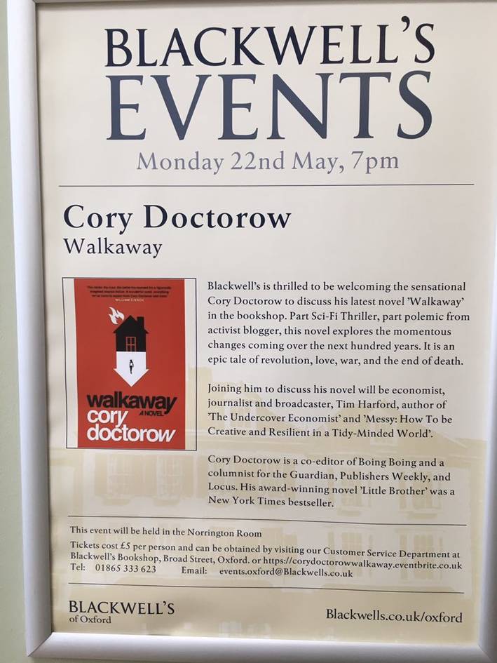 I’m in the UK for the British Walkaway tour, which kicks off tonight at 7PM in Oxford where I’ll be in conversation with Tim Harford at Blackwells.